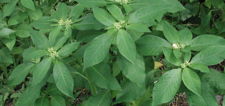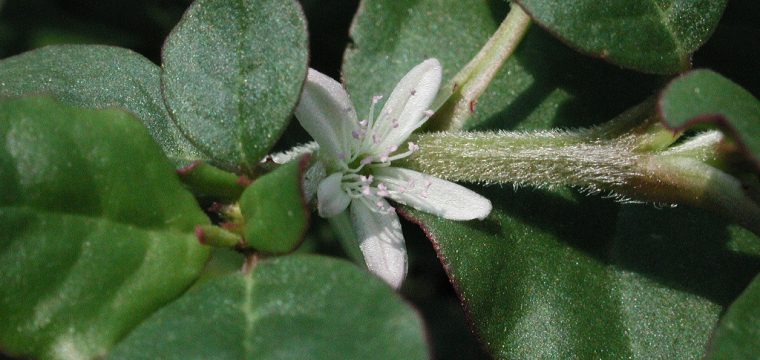วัชพืชปีเดียว เป็นไม้ล้มลุก แผ่แบนตามพื้น ลำต้นออกจากโคนต้น ผิวมีขนประปรายหรือเรียงเป็นแถบตามยาว ใบเดี่ยวออกกึ่งตรงข้าม รูปกลมหรือรูปไข่กลับหรือรูปไข่ ยาว 0.3 – 1.2 เซนติเมตร กว้าง 0.1 – 1.6 เซนติเมตร ปลายใบแหลมหรือกลม ฐานใบสอบ ขอบใบเรียบ สีแดง