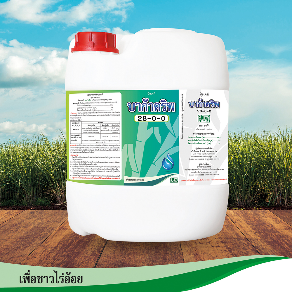 ชื่อการค้า : บาก้าดริพ 28-0-0 ชื่อสามัญ : – คุณสมบัติ : เร่งการเจริญเติบโตทั้งต้นและใบ โดยพืชสามารถดูดซึมธาตุอาหารได้ทันที ขนาดบรรจุ : 20 ลิตร
