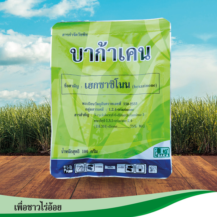 ชื่อการค้า : บาก้าเคน ชื่อสามัญ : เฮกซาซิโนน (hexazinone 75% WG) คุณสมบัติ : สารกำจัดวัชพืชใบแคบ ใบกว้างและกก ใช้ฉีดพ่นหลังวัชพืชงอก ขนาดบรรจุ : 100 กรัม