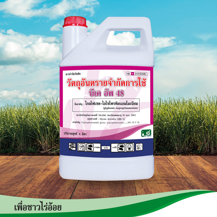 ชื่อการค้า : บีเค อัพ 48 ชื่อสามัญ : ไกลโฟเซต-ไอโซโพรพิลแอมโมเนียม (glyphosate – isopropylammonium 48% SL) คุณสมบัติ : สารกำจัดวัชพืชใบแคบ ออกฤทธิ์แบบดูดซึม ใช้ฉีดพ่นหลังวัชพืชงอก ไม่ทำให้ดินแข็ง ขนาดบรรจุ : 4,000 มิลลิลิตร