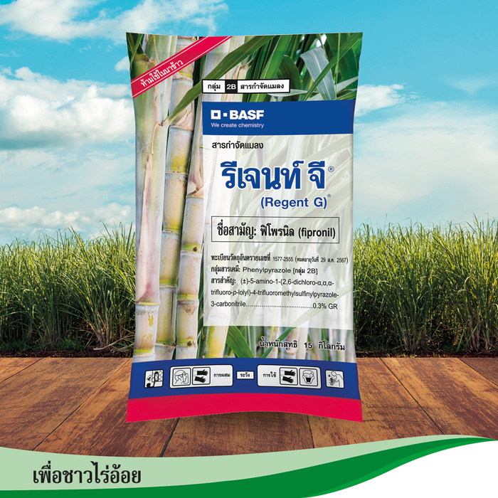 ชื่อการค้า : รีเจนท์ จี ชื่อสามัญ : ฟิโฟรนิล (fipronil 0.3% GR) คุณสมบัติ : ใช้ในการป้องกันและกำจัด หนอนกออ้อย กรณีอ้อยปลูกใหม่อาจใช้ผสมกับปุ๋ยรองพื้น ในช่วงปลูก กรณีอ้อยตอ อาจใช้ป้องกันโดยผสมกับปุ๋ย หรือใช้หว่าน ขนาดบรรจุ : 15 กิโลกรัม