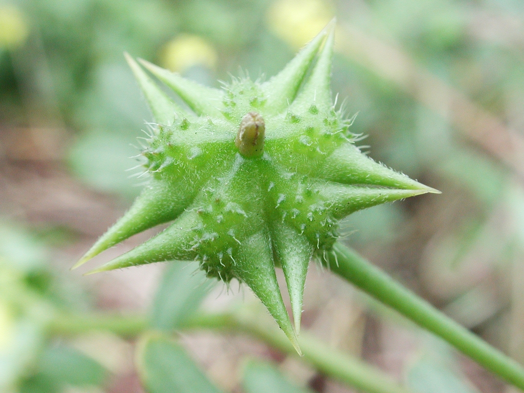 วัชพืชปีเดียว ไม้ล้มลุกทอดเลื้อย อายุปีเดียว ใบ เป็นใบประกอบแบบขนนก ใบย่อยมี 48 คู่ รูปขอบขนาน กว้าง 0.2 – 0.5 เซนติเมตร ยาว 0.5 – 1.5 เซนติเมตร โคนเบี้ยว ปลายมน ผิวใบมีขนนุ่มทั้งสองด้าน ก้านใบย่อยสั้นจนเกือบไม่มี ดอก เป็นดอกเดี่ยว สีเหลืองสด บานแผ่ ขนาด 0.72 เซนติเมตร กลีบรองดอก 5 กลีบ รูปรีหรือรูปไข่กลับ เกสรเพศผู้ 10 อัน ผลรูปป้อม มีหนามแหลมทั่วไป พบได้ทั่วไป ตามไหล่ทาง ที่รกร้างว่างเปล่า ทนแล้งได้ดี ขึ้นได้ดีในดินทรายที่ค่อนข้างแห้ง มีการระบายน้ำได้ดี